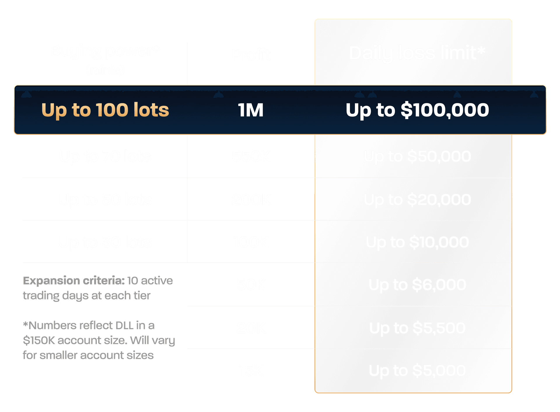 Your daily loss limit adjusts up or down with your account balance. Grow your account and earn more room to perform.