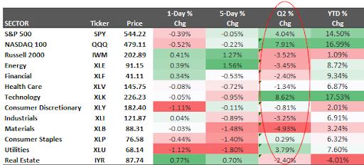 Technology (XLK) had the strongest performance, with a Q2 change of 8.62%. Utilities (XLU) and Consumer Staples (XLP) also did well, with a Q2 change of 3.79% and 0.29%, respectively.