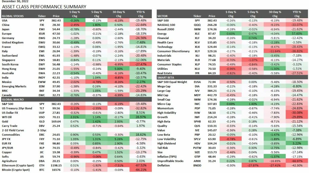 It’s reflection time as we close out 2022. U.S. stock traders saw some of their biggest losses since the 2008 Financial Crisis. The S&P 500 finished the year -19.5% lower, small caps (as represented by the Russell 2000) ended lower by nearly -21%, and the Nasdaq 100 lost -33.07% of its value.