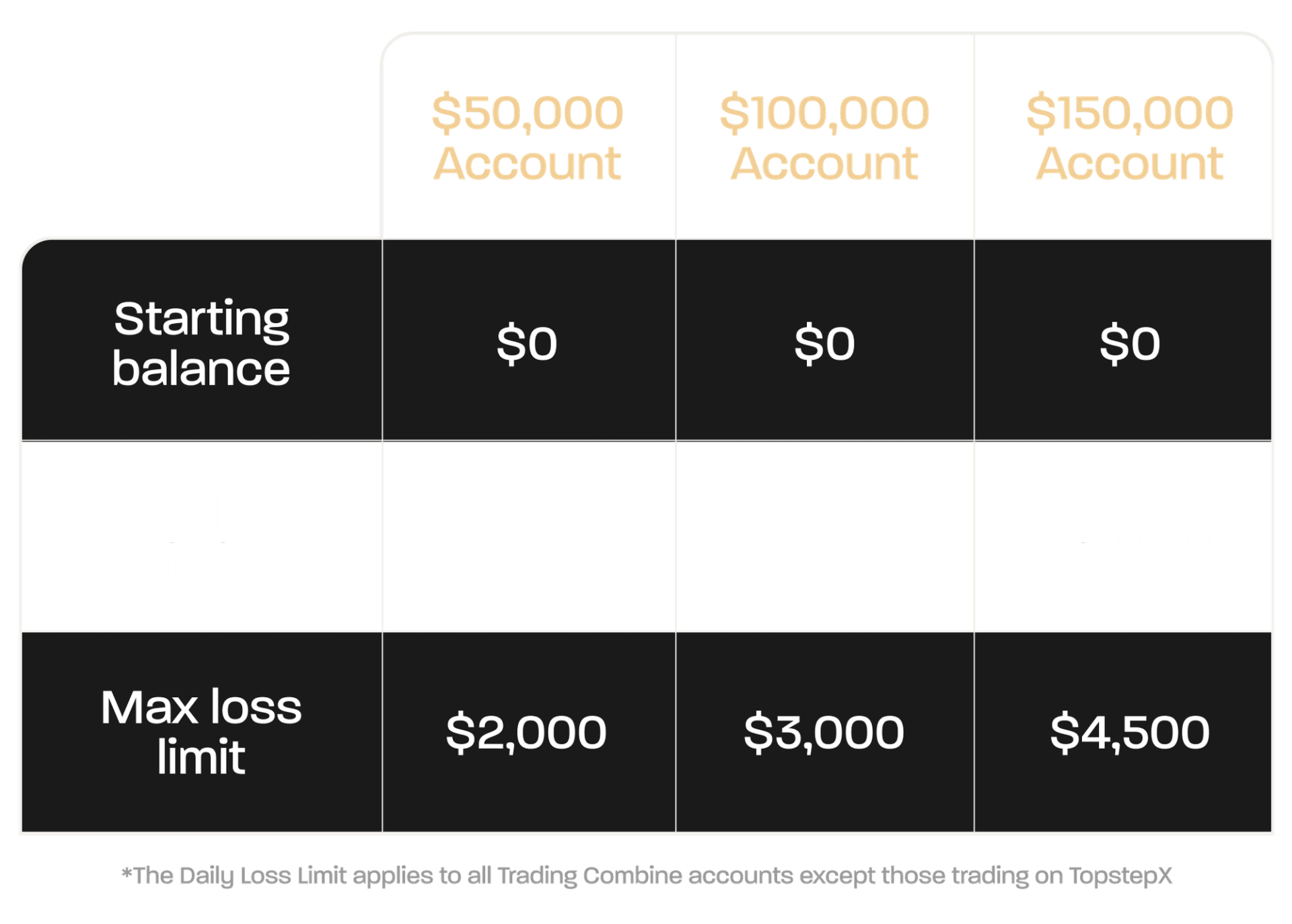Each Express Funded Account starts with a $0 balance and includes a Max Loss Limit based on your Trading Combine® size: $2,000 for $50K accounts, $3,000 for $100K, and $4,500 for $150K. Your balance can go below $0 to accommodate your Max Loss Limit. If your Max Loss Limit balance increases to $0, your account will lock at $0. Accounts trading on platforms other than TopstepX are also subject to a Daily Loss Limit as outlined below.