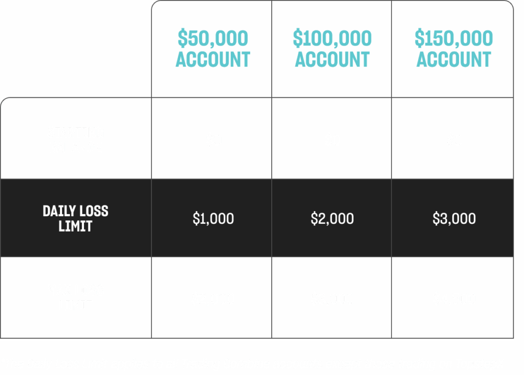 Each Express Funded Account starts with a $0 balance and includes a Max Loss Limit based on your Trading Combine® size: $2,000 for $50K accounts, $3,000 for $100K, and $4,500 for $150K. Your balance can go below $0 to accommodate your Max Loss Limit. If your Max Loss Limit balance increases to $0, your account will lock at $0. Accounts trading on platforms other than TopstepX are also subject to a Daily Loss Limit as outlined below.