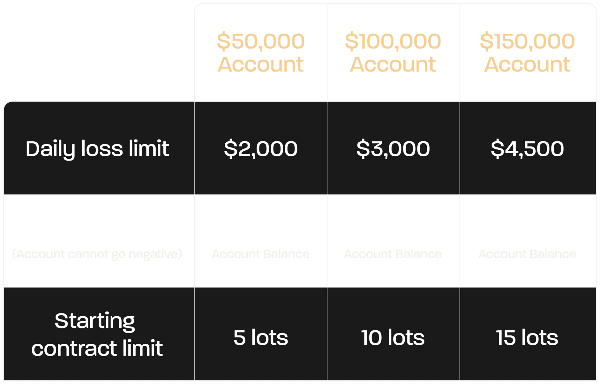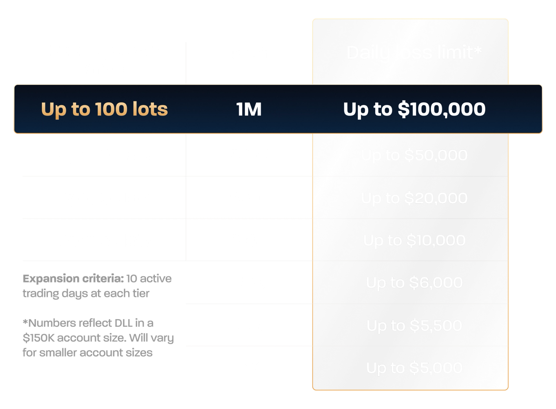 | $50,000 Account | 2 Lots | 3 Lots | 5 Lots | - | - |
